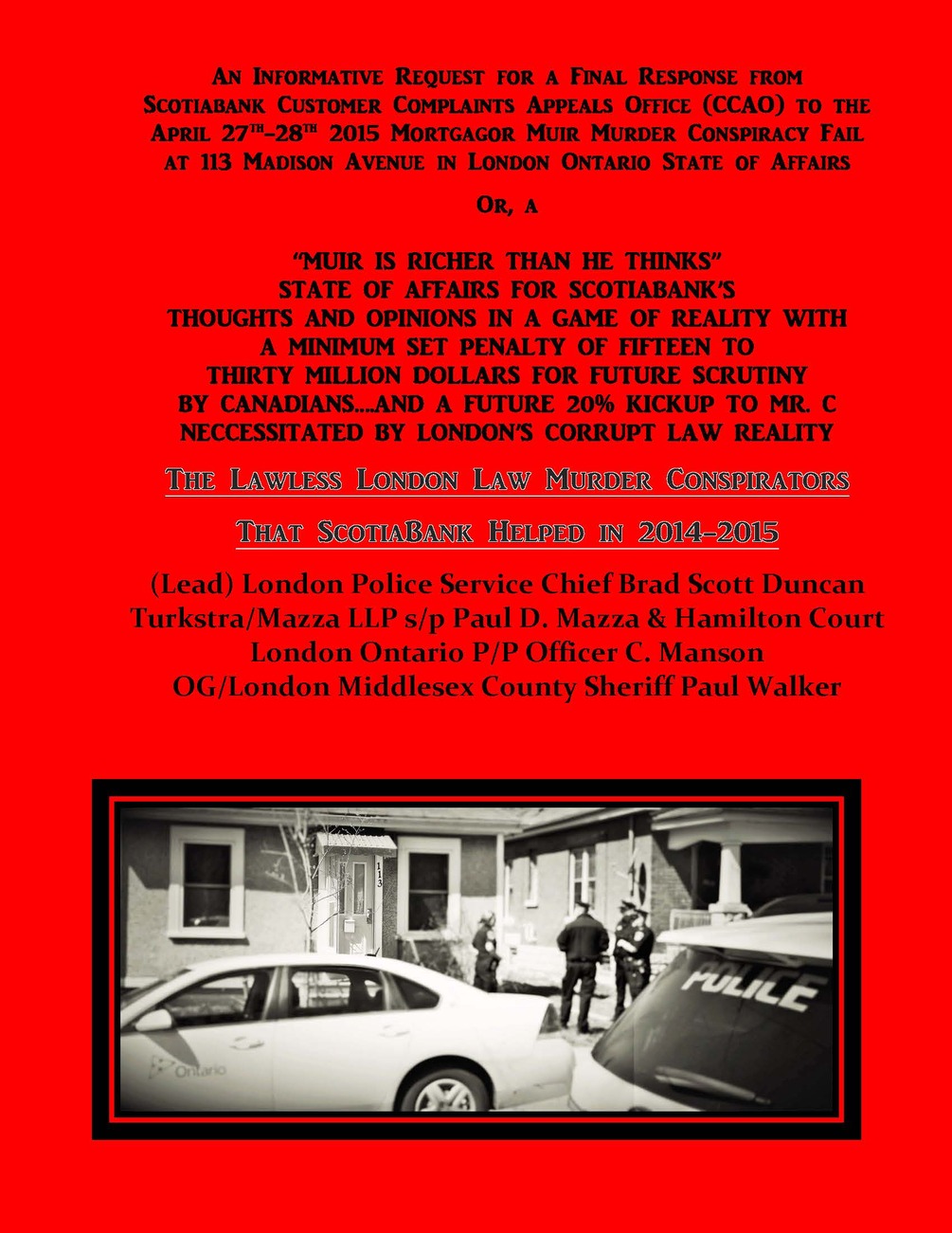 This "complaint" to Scotiabank in the Fall of 2022 was met with the only sensible, truthful and accountable reply from all of this nefarious and malicious actions in conjunction with the Lawless London Law which is included in this same version published on AMAZON KDP for paperback sale in September of 2023. It is also part of making some funds of which to one day kick-up to Mr. C whatever 20% will amount too. That depends on Scotiabank's President when the time comes though. One day.